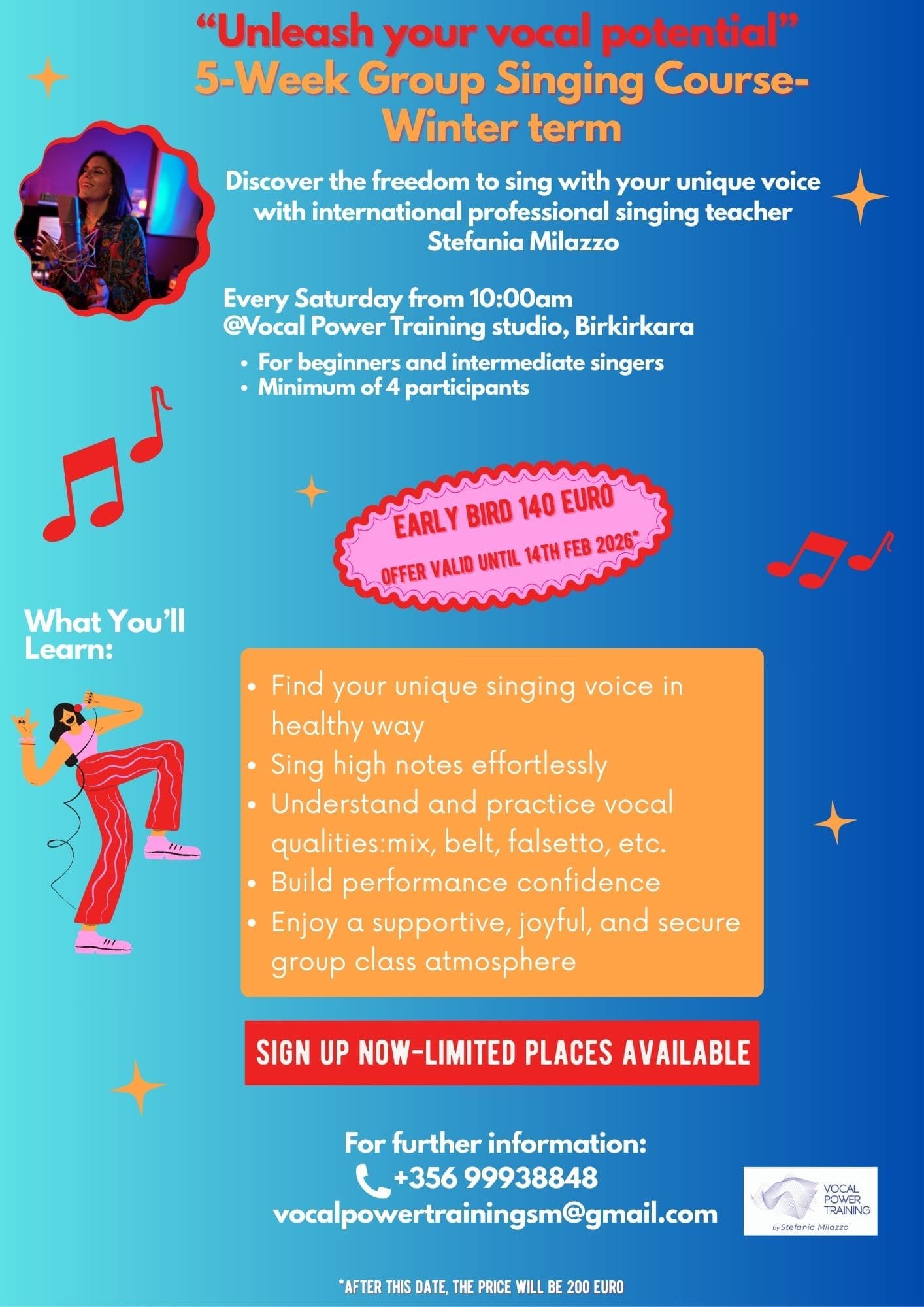 With over 20 years’ experience as a professional singer, songwriter and vocal coach, I offer online one-to-one singing lessons and vocal training to suit all levels of experience and ages. I also offer in-person lessons in Malta, where I’m currently based.